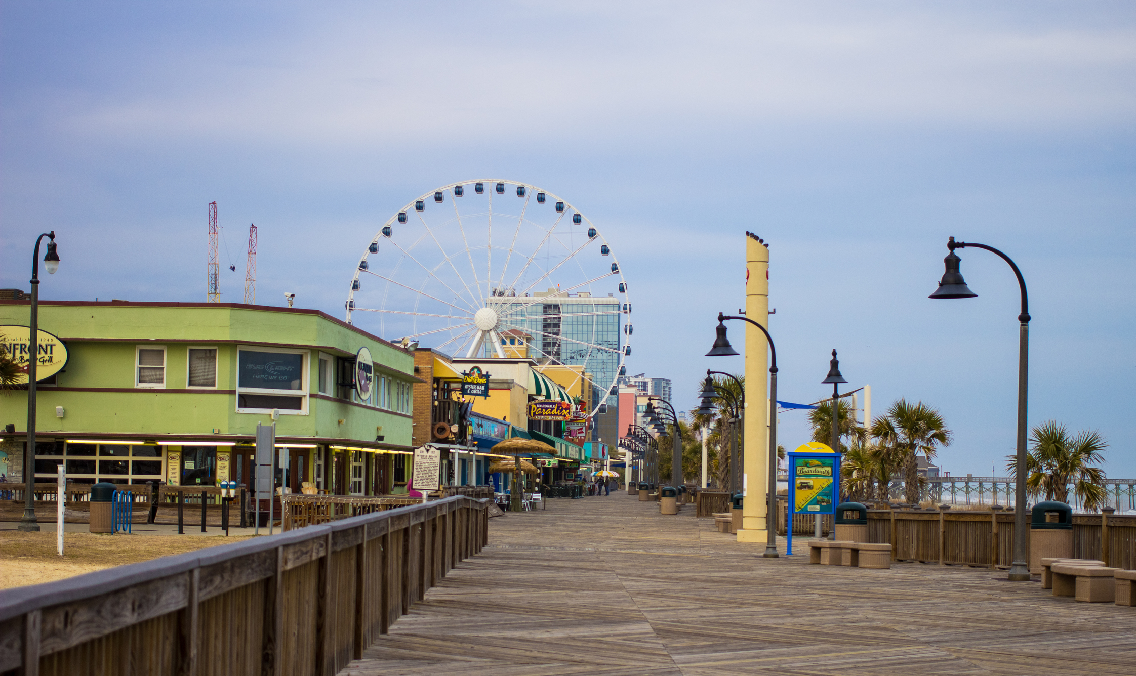 Reminiscent of the famed boardwalks up and down the East Coast, the Myrtle Beach boardwalk and promenade is a wide, airy, and lively place to be located at 14th Avenue North to the Second Avenue North Fishing pier and Restaurant. Stroll down memory lane or make new memories. The choice is yours.